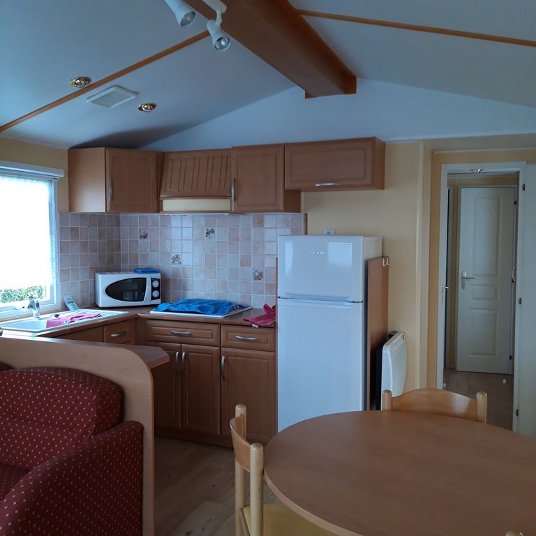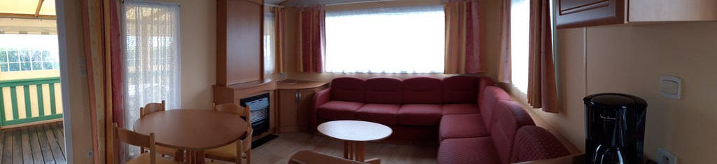 Cuisine équipée: réfrigérateur-congélateur, plaque gaz, hotte / Séjour panoramique avec banquette en U